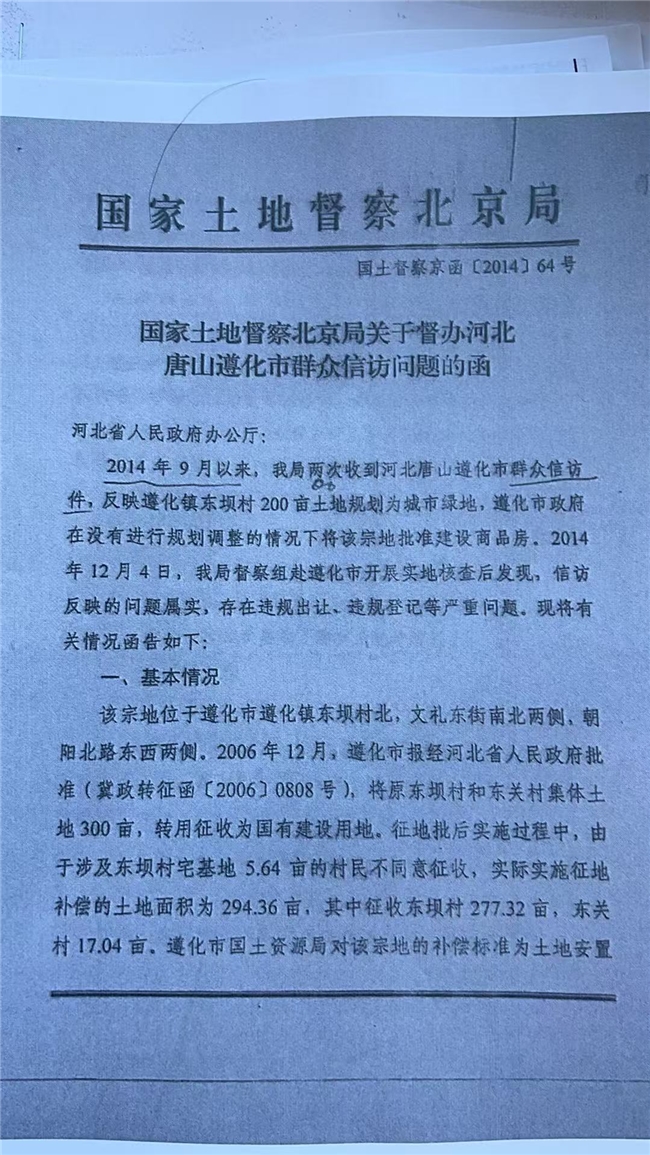 2014年12月30日,国家土地督察北京局以国土督察京函(2014)64号文的形式,向河北省政府办公厅致《国家土地督察北京局关于督办河北唐山遵化市群众信访问题的函》。督察函说:“2014年9月以来,我局两次收到河北唐山遵化市群众信访件,反映遵化镇东坝村200亩土地规划为城市绿地,遵化市政府在没有进行规划调整的情况下将该宗地批准建设商品房。2014年12月4日,我局督察组赴遵化市开展实地核查后发现,信访反映的问题属实,存在违规出让、违规登记等严重问题。”