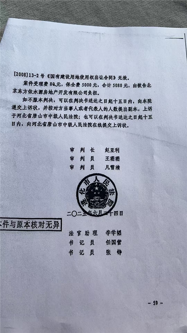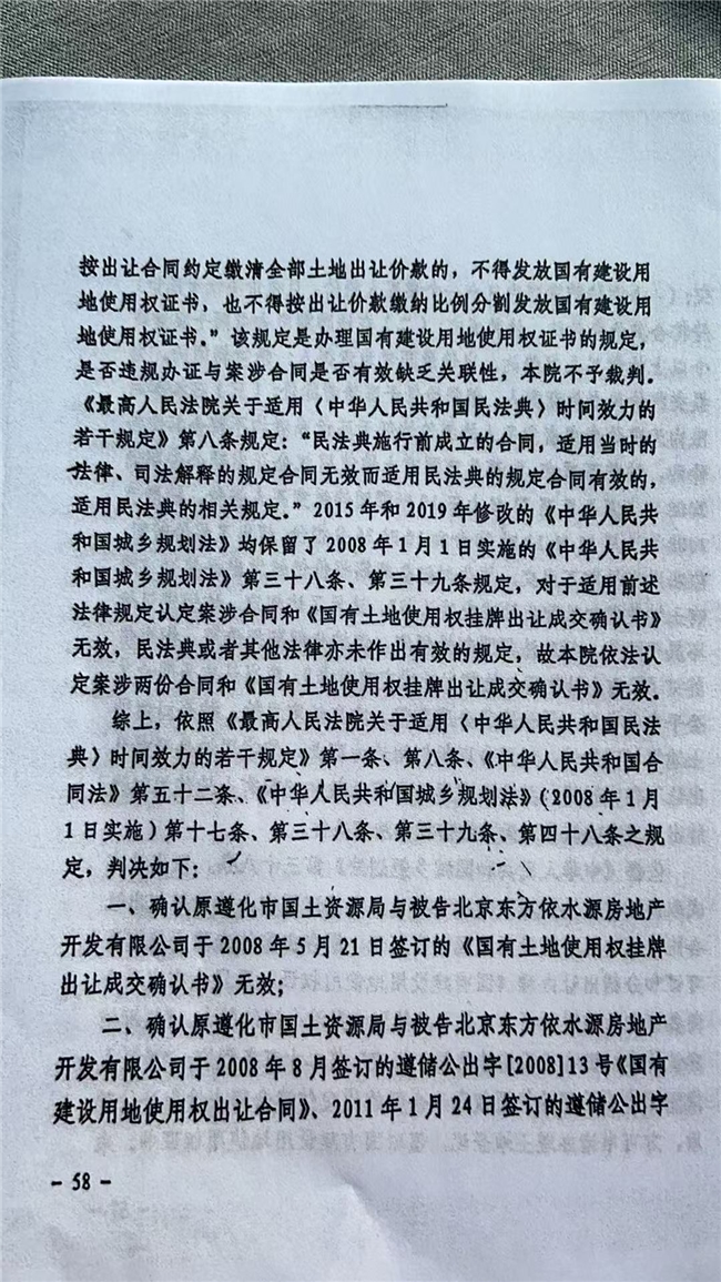2025年6月24日,在尊重历史、尊重证据、尊重事实、尊重法律、尊重法规、尊重政策、尊重政府文件的基础上,经三位法官严格审理,遵化市人民法院做出一审判决:确认原遵化市国土资源局与被告依水源公司于2008年5月21日签订的《国有土地使用权挂牌出让成交确认书》无效;确认两份涉诉出让合同均无效;案件受理费、保全费由依水源公司负担。